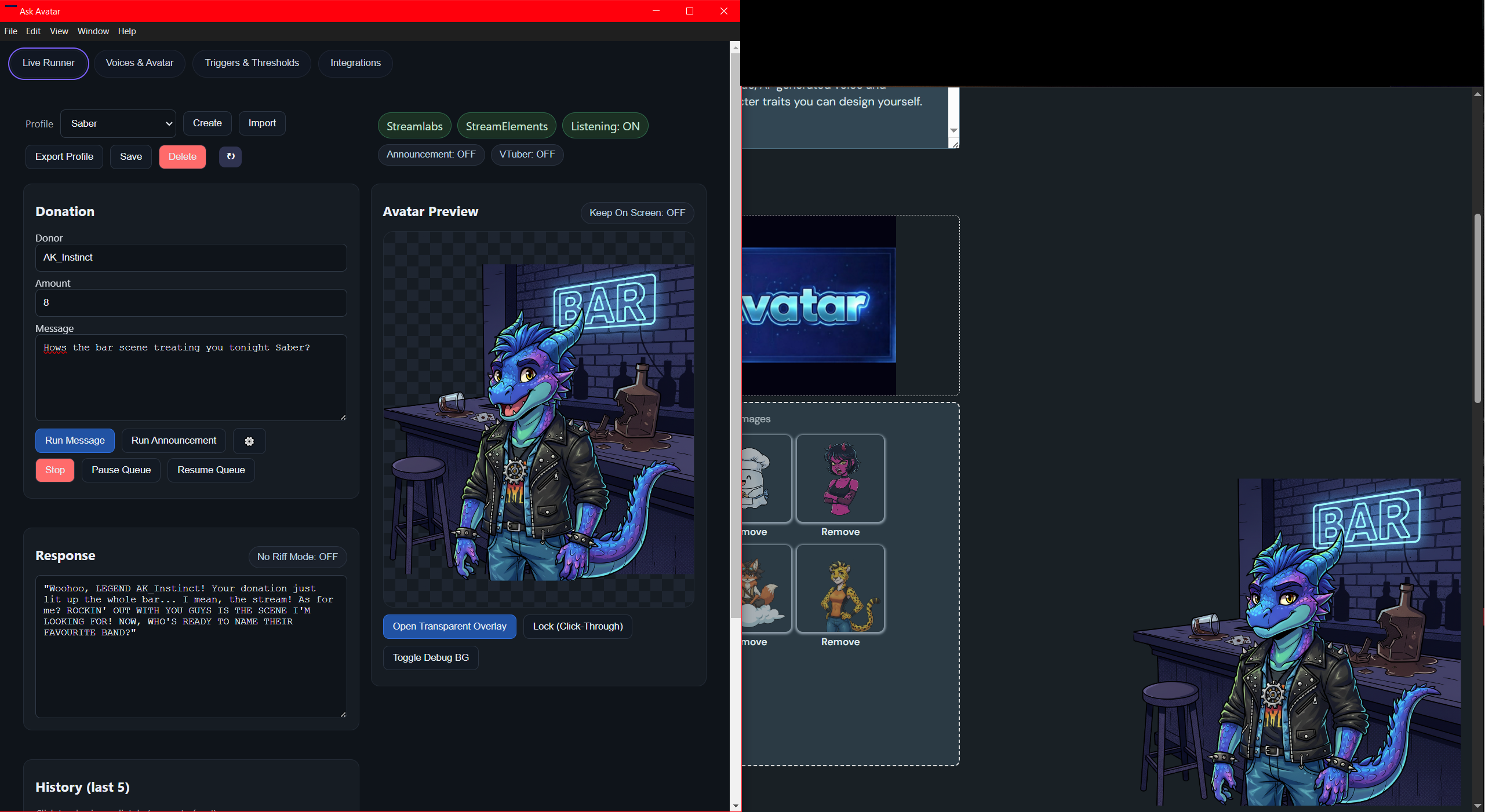 AskAvatar is a revolutionary new tool designed to transform how streamers interact with their audience. Our AI-powered avatars listen in real-time for donations, subscriptions, raids, bits, follows, and more. Your avatar then responds LIVE on stream with a unique, AI-generated voice and message based on a persona and character traits you define.