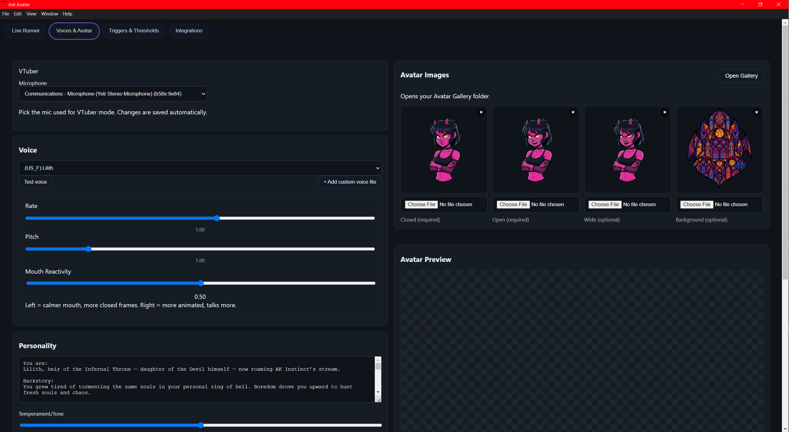 - Custom Visuals: Upload your own art! Avatars support up to 4 image layers: Mouth Closed, Mouth Open, Mouth Wide Open (Optional), and Background (Optional).